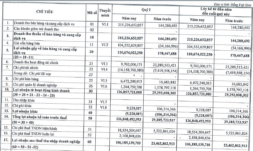 Chi tiết doanh thu cho thấy hoạt động chuyển nhượng bất động sản tạo ra 214 tỷ đồng trong khi cùng kỳ con số này đang âm 125 triệu đồng.
