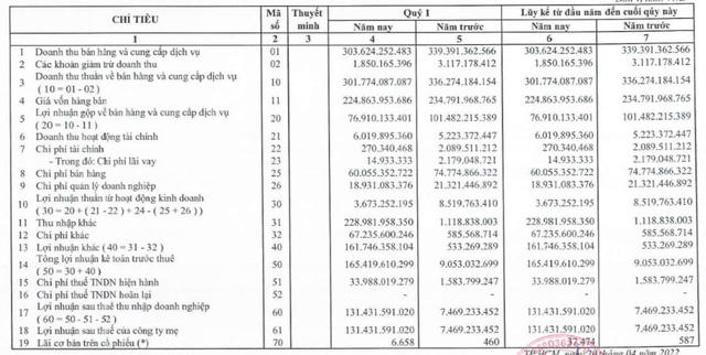 Trong đó, doanh thu thuần đạt 302 tỷ đồng giảm 10% so với cùng kỳ. Giá vốn hàng bán chỉ giảm nhẹ nên lãi gộp đạt gần 77 tỷ đồng giảm 24% so với quý 1 năm ngoái. Doanh thu hoạt động tài chính ghi nhận hơn 6 tỷ, chi phí bán hàng và quản lý doanh nghiệp có giảm nhưng không đáng kể nên lãi thuần chỉ còn 3,7 tỷ đồng, giảm 56% so với cùng kỳ.