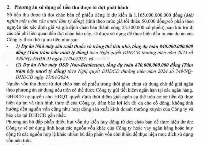 Nguồn vốn thu được từ đợt chào bán cổ phiếu riêng lẻ sẽ ưu tiên phân bổ cho hai dự án quy mô lớn gồm Nhà máy sản xuất thuốc vô trùng thể tích nhỏ (tổng mức đầu tư 840 tỷ đồng) và Nhà máy OSD Non-Betalactam (870 tỷ đồng).