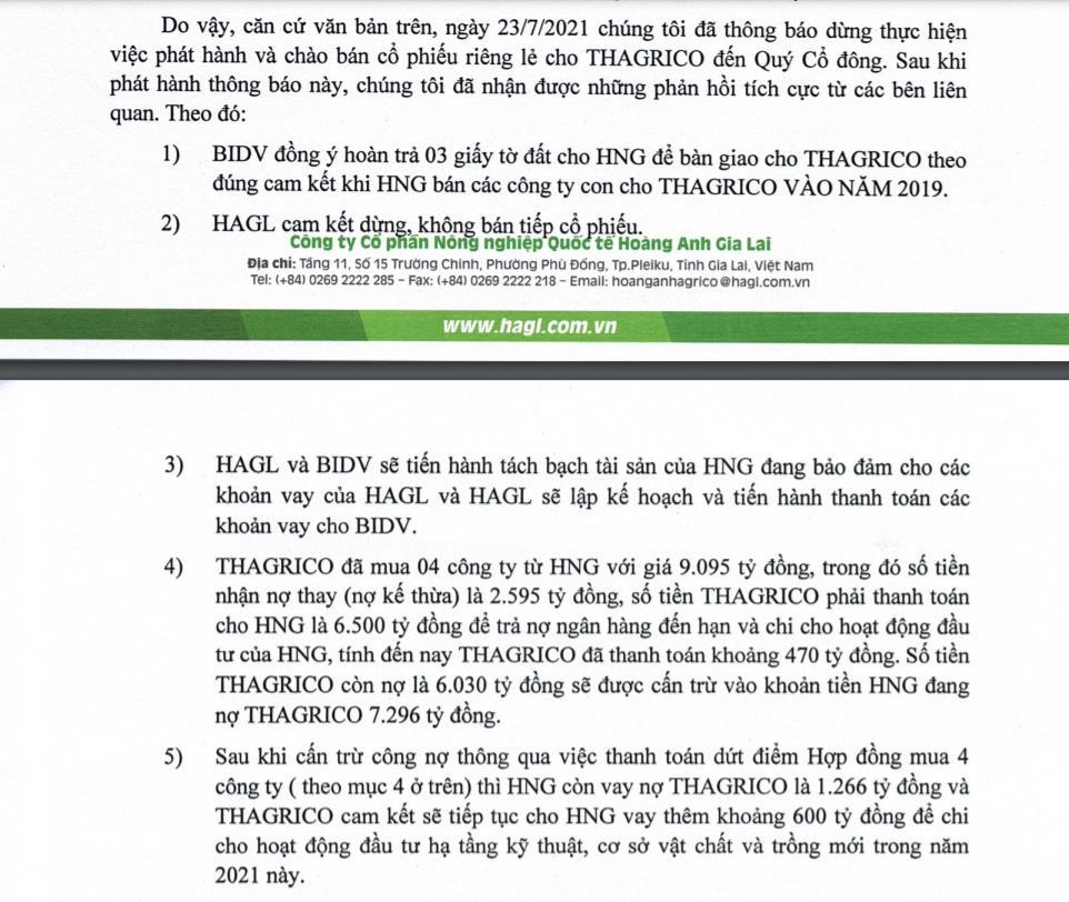 "Sau khi phát hành thông báo này, chúng tôi đã nhận được những phản hồi tích cực từ các bên liên quan", HAGL Agrico thông báo tới các cổ đông trưa hôm nay (26/7). Theo đó, HAGL Agrico cho biết BIDV đồng ý hoàn trả 3 giấy tờ đất cho HAGL Agrico để bàn giao cho Thagrico theo đúng cam kết do HNG bán các công ty con cho Thagrico vào năm 2019.