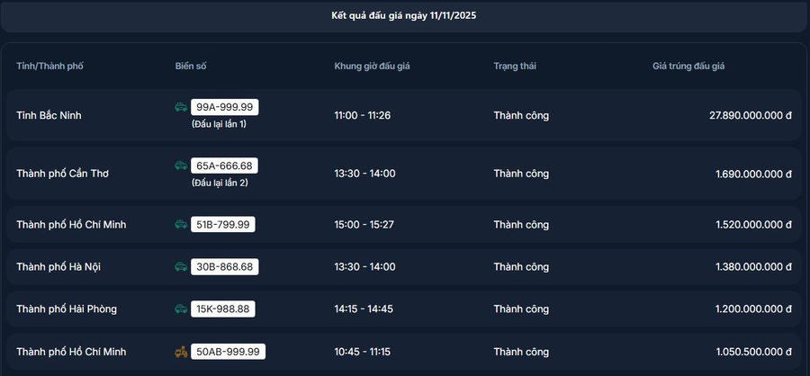 Phiên đấu giá ngày 11/11 ghi nhận mức giá trúng kỷ lục mới cho biển số 99A-999.99 của Bắc Ninh sau khi đấu giá lại lần 2, đạt 27,89 tỷ đồng. Thị trường cũng chứng kiến biển số xe máy 50AB-999.99 (TP. Hồ Chí Minh) được chốt giá 1,05 tỷ đồng.
