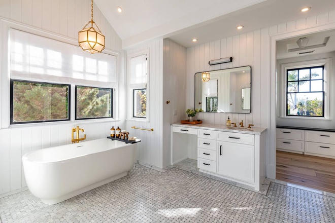 Phòng tắm rộng rãi với sắc trắng làm chủ đạo và cửa sổ lớn đón ánh sáng tự nhiên.