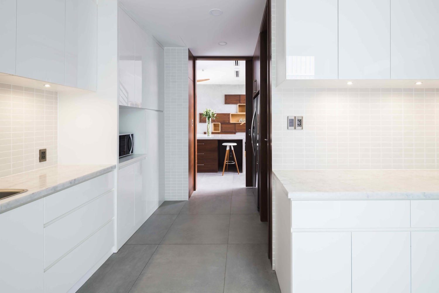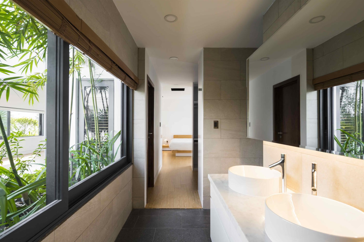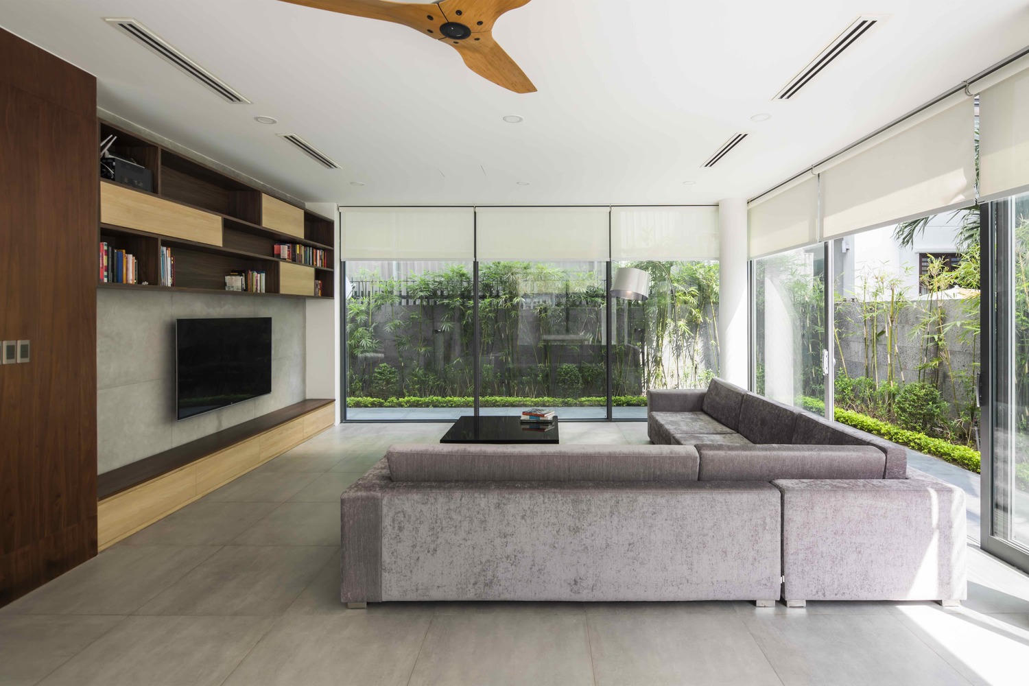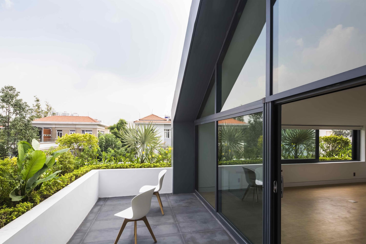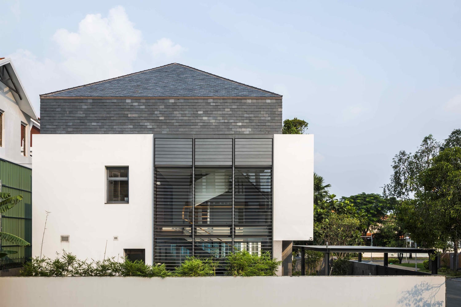 Ngôi nhà nằm ở hướng Tây nên có những cách thiết kế phù hợp để hạn chế nhiệt, cây cối được trồng um tùm nhằm đem lại sự xanh tươi và riêng tư. Tông màu trắng được ưa chuộng trong thiết kế ngôi nhà.