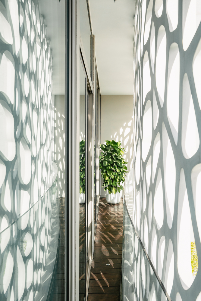 Mặt tiền của ngôi nhà được thiết kế từ bê tông sợi với hoa văn như rạn san hô vừa giúp công trình tiết kiệm năng lượng vừa tạo nên vẻ ngoài độc đáo.