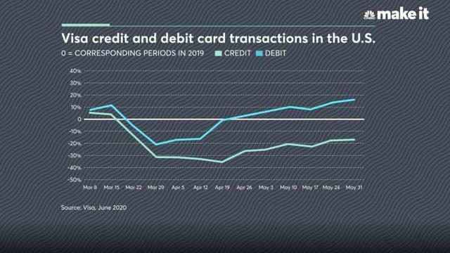 Khi nhiều quốc gia tiến hành phong tỏa vì đại dịch Covid-19, các giao dịch trên thẻ visa đã giảm hơn 30% so với đầu năm 2019 ở đầu năm 2020. Các giao dịch bằng thẻ ghi nợ cũng sụt giảm trong cùng thời kỳ nhưng nhanh chóng phục hồi vào tháng 5, thời điểm người tiêu dùng bắt đầu được nới lỏng giãn cách.