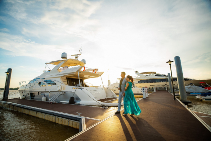 Đôi vợ chồng tình tứ tận hưởng không gian lãng mạn, riêng tư trên du thuyền sang trọng. Anh Thơ thích thú khi ngắm vẻ đẹp sông nước và tỏ rõ sự hài lòng vì đã chọn biệt thự tại đô thị đảo Phượng Hoàng làm không gian sống.