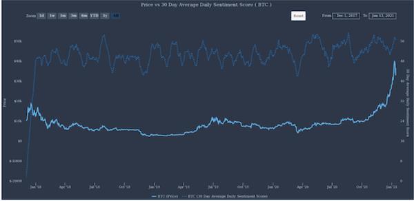 Nhìn vào điểm số tâm lý hàng ngày trung bình trong 30 ngày đối với Bitcoin cho thấy, mặc dù có sự sụt giảm, điểm số trung bình chỉ giảm nhẹ so với mức cao gần đây và cao hơn nhiều so với mức thấp đã thấy trong các chu kỳ giảm giá trước đó.