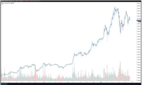 Theo một chuyên gia phân tích kỹ thuật, dữ liệu lịch sử của Bitcoin cho thấy, các đường dốc parabol nhanh chóng thường xuất hiện và theo sau bởi các đợt điều chỉnh thảm khốc, tương tự như điều đã thấy sau đợt tăng giá năm 2017. Những điểm tương đồng của thị trường hiện tại với giai đoạn "hưng phấn" của đợt tăng giá 2017 đến 2018 trong khi đó lại không được chú ý.