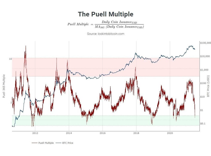 Theo Lark Davis, Youtuber và nhà đầu tư người New Zealand, hiện tại, thị trường Bitcoin đang ra dấu hiệu “mua vào” lần thứ năm trong lịch sử. Dựa vào biểu đồ Puell Multiple, Davis cho rằng giá Bitcoin hiện đã chạm “vùng xanh” lần đầu kể từ hồi tháng Ba năm ngoái, và đây là cơ hội không thể tốt hơn để mua vào Bitcoin.