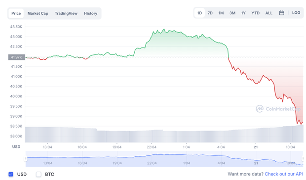 Theo dữ liệu của CoinMarketCap trưa ngày 21/1, giá đồng Bitcoin hiện được giao dịch quanh mức 38.600 USD, giảm hơn 7,7% trong 24 giờ qua. Đây cũng là mức thấp nhất của Bitcoin kể từ tháng 8/2021.