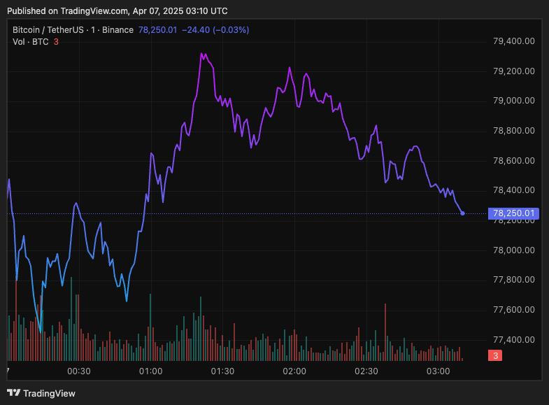 Trong đêm ngày 6/4 và rạng sáng 7/4, cả thị trường tiền số như bị dội một gáo nước lạnh. Bitcoin – biểu tượng quyền lực của thế giới crypto – đã giảm gần 5%, xuyên thủng mốc 79.000 USD, chạm đáy ba tuần ở ngưỡng 78.892 USD. Không riêng gì BTC, cả Ethereum cũng mất hơn 9,6%, Solana lao dốc gần 10%, còn những cái tên nhỏ hơn như AVAX, DOT hay ADA cũng không thoát khỏi “vết trượt” từ 6–15%.