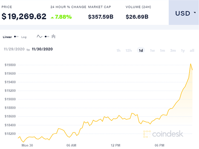 Giá mỗi đồng Bitcoin tối 30/11 có thời điểm lên 19.850 USD, vượt đỉnh năm 2017.