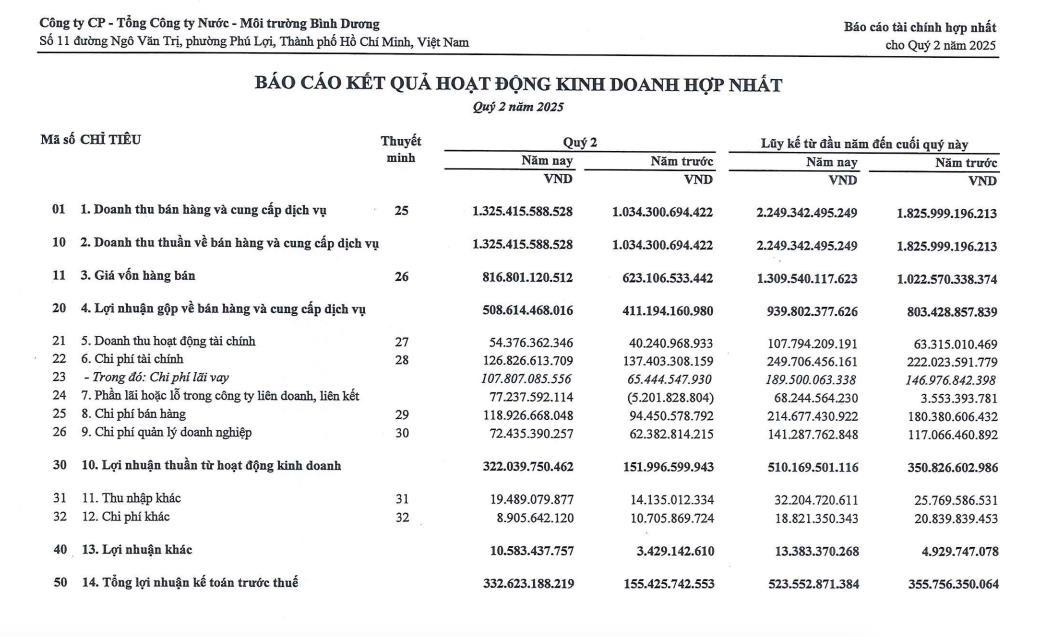Về bức tranh tài chính, quý II/2025, BWE ghi nhận doanh thu thuần đạt 1.325 tỷ đồng, tăng gần 300 tỷ đồng so với cùng kỳ năm ngoái. Lãi sau thuế đạt 298 tỷ đồng, tăng 116,1% so với quý II/2024.