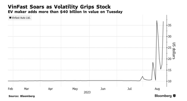 Tuy nhiên, theo biến động của thị trường, giá cổ phiếu VinFast cũng có những nhịp điều chỉnh. Ngày 22/8, VFS đã gây bất ngờ cho nhà đầu tư khi kết phiên tăng gần 109% giúp giá trị vốn hoá VinFast tăng thêm 44 tỷ USD, theo Bloomberg.
