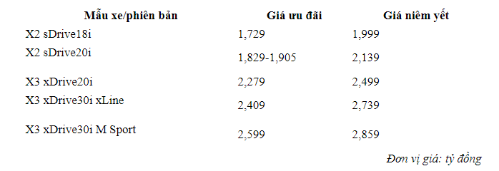 Trong bảng giá ưu đãi mới mà các đại lý BMW vừa công bố, ngoài mẫu X1 phiên bản cũ, các mẫu X2 và X3 lần đầu giảm giá tới hơn 300 triệu đồng. Ở lần ưu đãi này, BMW X3 giảm cao nhất tới 330 triệu đồng, còn giá X2 giảm 310 triệu đồng. Trước đây, BMW X3 đã từng được giảm giá nhưng mức giảm cao nhất chỉ 42 triệu đồng.