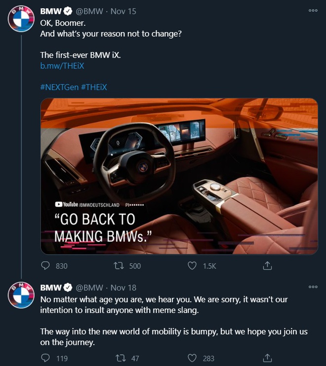 Đáp trả, BMW cách đây khoảng một tuần đăng lên Twitter để chia sẻ thông tin về chiếc xe điện BMW iX vừa ra mắt, kèm theo đoạn mô tả: "Ok, Boomer. Có lý do nào để không thay đổi không nhỉ?".