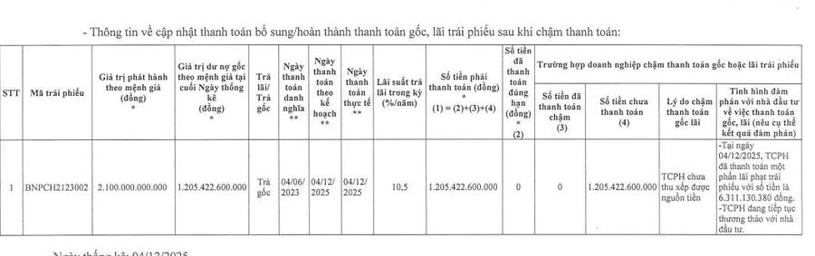 Theo kế hoạch ngày 3/12/2025, BNP Global phải thực hiện thanh toán gần 1.206,2 tỷ đồng tiền gốc cho lô trái phiếu mã BNPCH2123002. Tuy nhiên, do chưa thu xếp được nguồn tiền nên BNP Global mới chỉ thanh toán chậm được một phần tiền, còn lại hơn 1.205,4 tỷ đồng chưa được thanh toán.