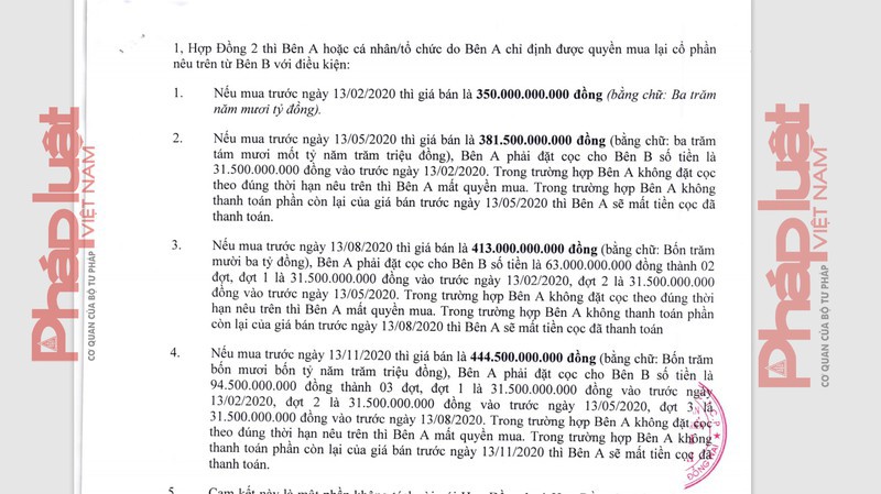 Ngày 28/5/2020, một bản cam kết bán lại khác đã được lập ra để bổ sung cho cam kết ngày 13/12/2019. Theo đó, nếu bên bán “mua lại” trước ngày 13/8/2020 thì giá bán là 416,5 tỷ đồng.