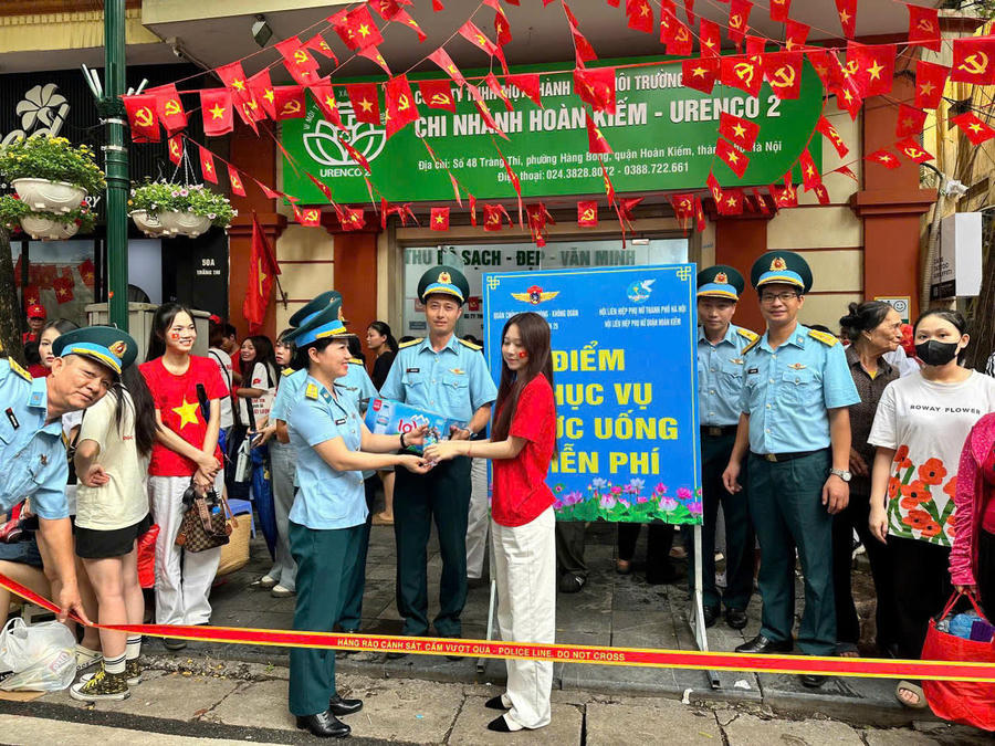 Tại số 85, phố Nguyễn Thái Học, nơi đứng chân của điểm cấp phát các vật phẩm, nhu yếu phẩm miễn phí cho nhân dân như: Cờ Tổ quốc, cờ Đảng cầm tay; nước lọc và các loại đồ uống đóng chai; lương khô; quạt giấy; áo mưa dùng một lần… do Sư đoàn 361 phối hợp với Hội Liên hiệp Phụ nữ, Trường Tiểu học Lý Thường Kiệt (Phường Văn Miếu- Quốc Tử Giám); Trường Tiểu học Nguyễn Viết Xuân (Phường Yên Hoà); Trường Tiểu học Tô Vĩnh Diện (Phường Ô Chợ Dừa) tổ chức đã thu hút rất nhiều người dân tới nhận quà và giao lưu văn nghệ với cán bộ, Quân nhân chuyên nghiệp của Sư đoàn 361 và các cô giáo đang thực hiện nhiệm vụ tại đây.