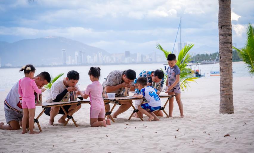 Buổi chiều, cả đoàn cùng nhau “bung xõa” với chuỗi trò chơi bãi biển. Sôi nổi nhất chính là phần tìm kho báu, khi các bé háo hức chạy khắp bãi cát, đào bới từng góc để lộ ra những chiếc thùng gỗ bí mật giấu phần thưởng bên trong. Mỗi lần một “kho báu” được khai quật, tiếng reo hò lại vang lên, làm không khí thêm phần cuồng nhiệt.