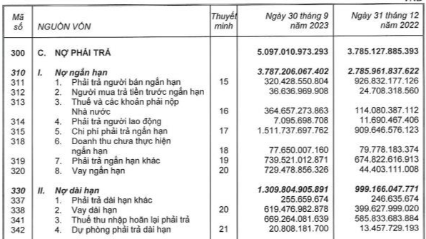 Tính đến cuối quý III, tổng nợ vay ngắn hạn và dài hạn tăng 203,8% so với đầu năm, lên mức 1.348,8 tỷ đồng. Nợ vay ngắn hạn là 729,5 tỷ đồng và nợ vay dài hạn là 619,5 tỷ đồng.