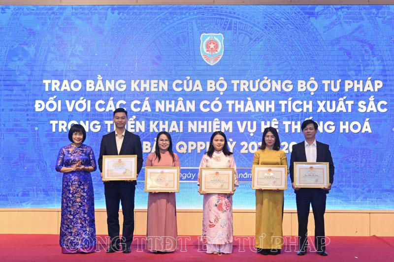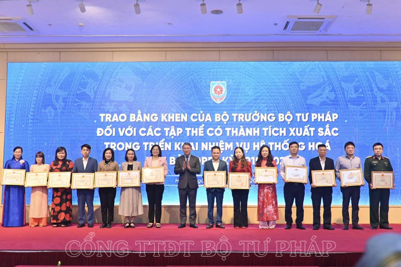Nhân dịp này, Bộ trưởng Nguyễn Hải Ninh, Thứ trưởng Đặng Hoàng Oanh đã trao Bằng khen của Bộ trưởng Bộ Tư pháp đối với các tập thể, các nhân có thành tích xuất sắc trong triển khai nhiệm vụ hệ thống hóa văn bản QPPL kỳ 2019-2023.