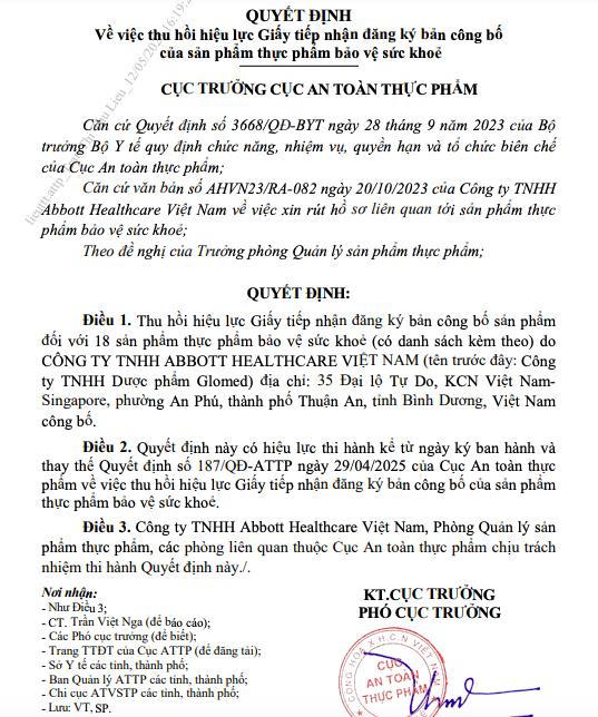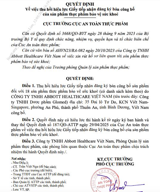 Cục An toàn thực phẩm (Bộ Y tế) ngày 12/5/2025 đã ban hành Quyết định số 209/QĐ-ATTP về việc thu hồi hiệu lực Giấy tiếp nhận đăng ký bản công bố sản phẩm đối với 18 sản phẩm thực phẩm bảo vệ sức khoẻ do Công ty TNHH Abbott Healthcare Việt Nam (tên trước đây là Công ty TNHH Dược phẩm Glomed) công bố.