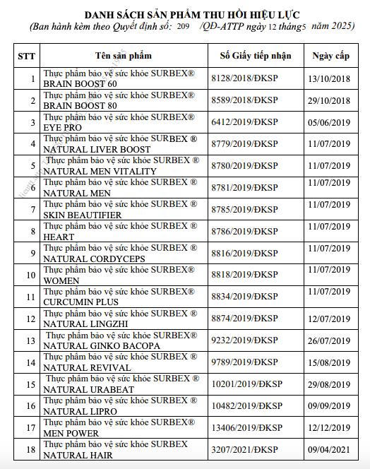 Trong số 18 sản phẩm thực phẩm bảo vệ sức khỏe, đáng chú ý có một số dòng sản phẩm phổ biến như Surbex Brain Boost 60 và Surbex Brain Boost 80, vốn được quảng bá với công dụng hỗ trợ tăng cường chức năng não bộ.