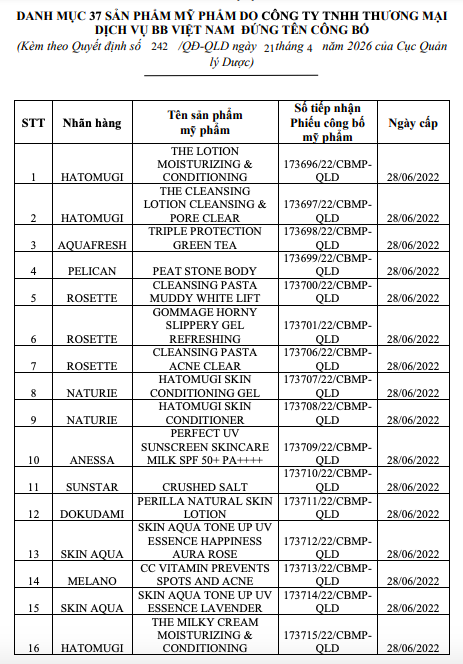 Cục Quản lý Dược, Bộ Y tế vừa ban hành quyết định xử phạt hành chính đối với Công ty TNHH Thương mại Dịch vụ BB Việt Nam, đồng thời yêu cầu thu hồi và tiêu hủy 37 sản phẩm mỹ phẩm vi phạm quy định.