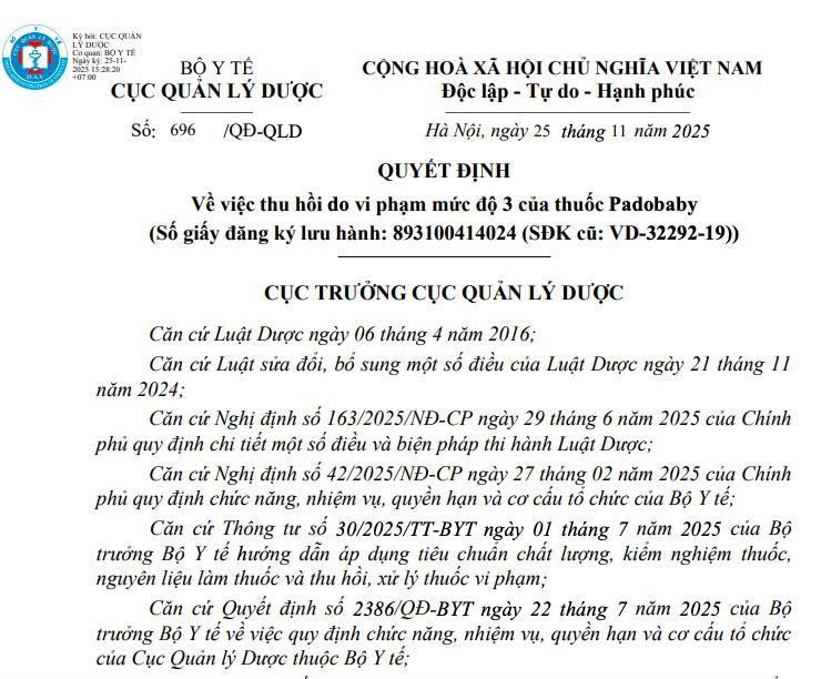 Ngày 25/11, Cục Quản lý Dược (Bộ Y tế) ban hành quyết định thu hồi toàn quốc lô thuốc bột uống Padobaby do vi phạm được xác định ở mức độ 3 - mức nghiêm trọng theo quy định hiện hành.