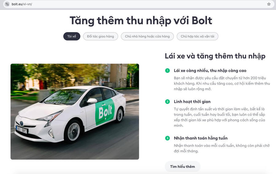 Bolt - ứng dụng gọi xe công nghệ có thị phần lớn ở châu Âu, châu Phi đang quảng cáo tuyển dụng tài xế trên các nền tảng mạng xã hội tại Việt Nam. Điều này cho thấy, rất có thể, Bolt sẽ bước chân vào thị trường Việt Nam trong thời gian tới.