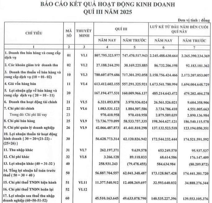 Kết quả, LIX lãi sau thuế 45,5 tỷ đồng trong quý III/2025, giảm 8% so với cùng kỳ.