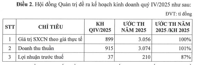 Cụ thể, Công ty đặt mục tiêu đạt 915 tỷ đồng doanh thu thuần và 37 tỷ đồng lãi trước thuế trong quý IV, tương đương tăng 30% về doanh thu nhưng giảm gần 54% về lợi nhuận so với kết quả cùng kỳ 2024.