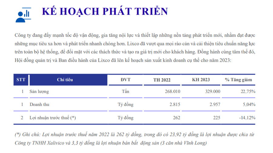 Công ty cổ phần Bột giặt LIX (Lixco - mã CK: LIX) vừa công bố báo cáo thường niên năm 2022 và đề ra mục tiêu kinh doanh năm 2023.