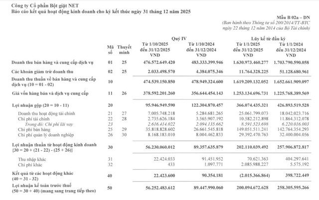 CTCP Bột giặt NET (HNX: NET) vừa công bố kết quả kinh doanh quý IV/2025 và cả năm 2025.