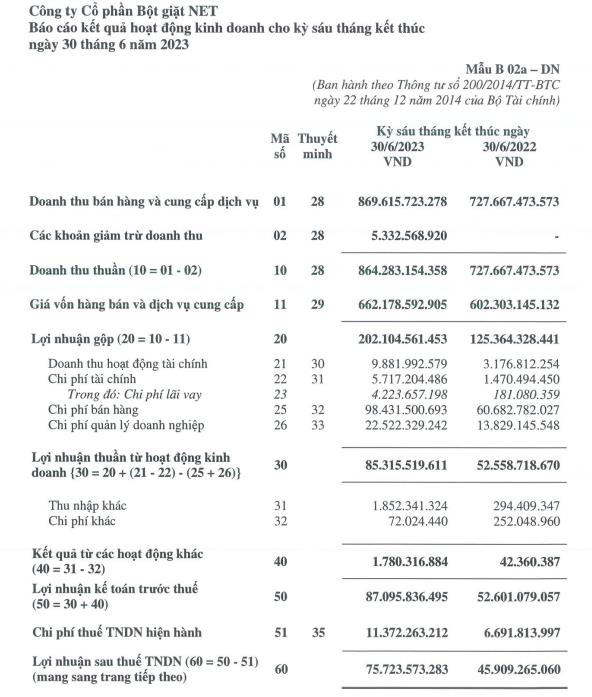 Về kết quả kinh doanh, theo báo cáo tài chính bán niên năm 2023, NET ghi nhận doanh thu thuần đạt 864,2 tỷ đồng, tăng 18,7% so với cùng kỳ.
