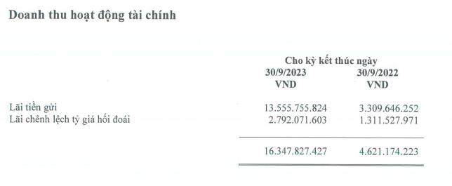 Doanh thu hoạt động tài chính tăng gấp 3,5 lần cùng kỳ lên mức 16,3 tỷ đồng, trong đó chiếm phần lớn là lãi tiền gửi với 13,55 tỷ đồng.