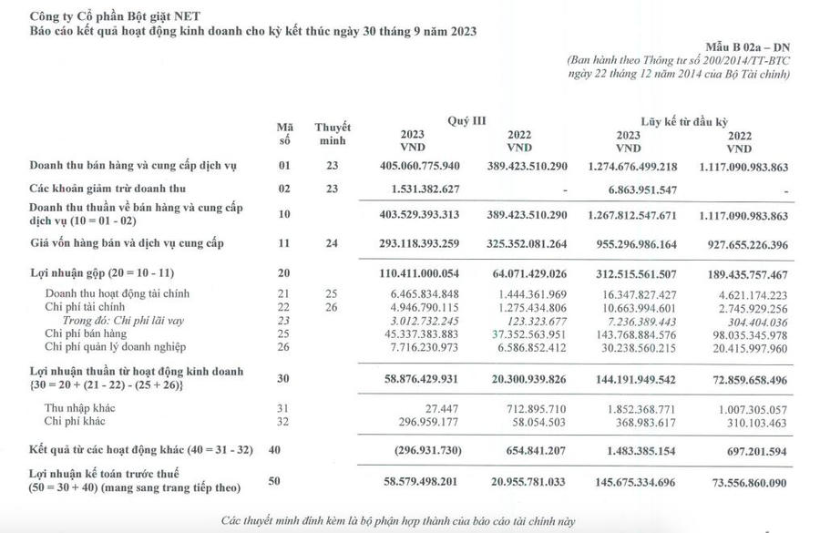Báo cáo tài chính hợp nhất quý III/2023 mà Công ty cổ phần Bột giặt NET (mã ck: NET) mới công bố cho thấy một kết quả tích cực.