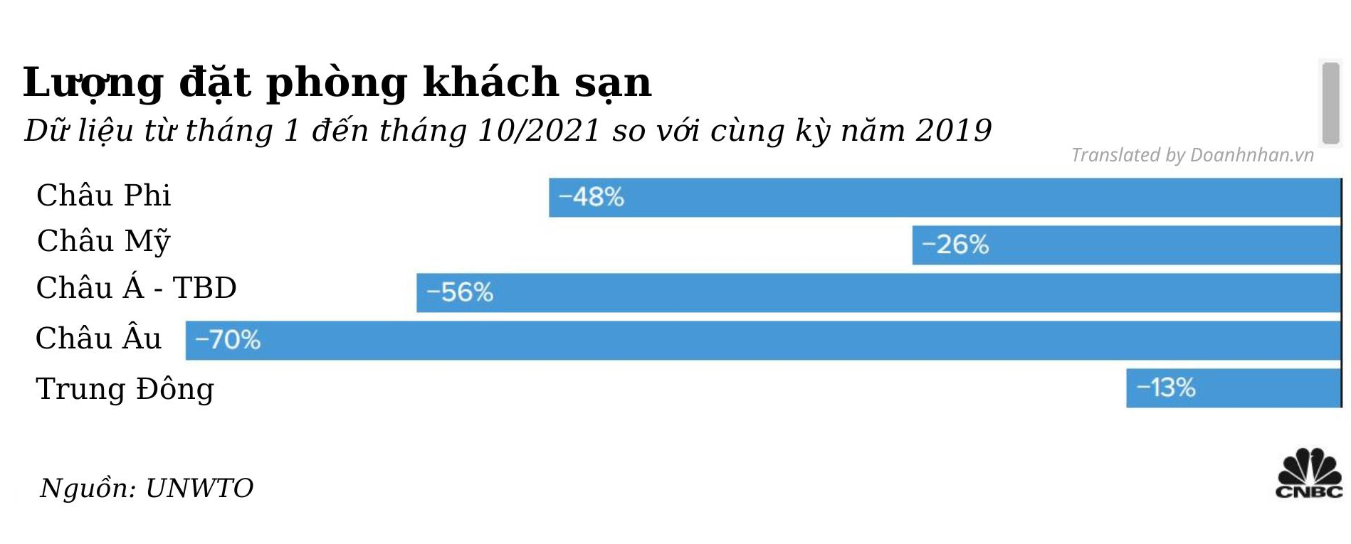Châu Âu là khu vực phục hồi chậm nhất. Lượng đặt phòng khách sạn từ tháng 1 đến tháng 10 năm nay thấp hơn 70% so với cùng kỳ của năm 2019. Ngược lại, khu vực Trung Đông hồi sinh mạnh mẽ nhất với lượng đặt phòng khách sạn từ tháng 1 đến tháng 10 năm 2021 chỉ thấp hơn 13% so với cùng kỳ năm 2019.
