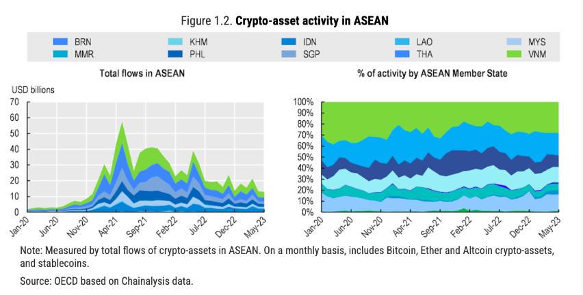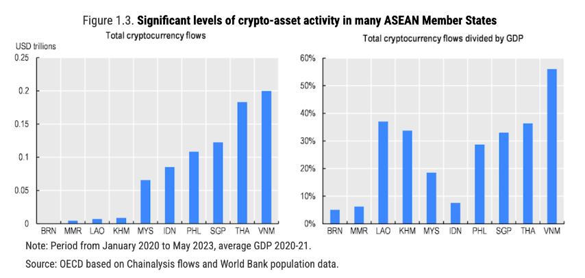 Dòng tài sản tiền điện tử bình quân đầu người khá lớn được ghi nhận ở hầu hết các quốc gia thành viên ASEAN, Việt Nam nhận được lượng dòng vốn lớn nhất trong giai đoạn 2020-2022 với tổng dòng vốn vào tiền điện tử là 190 tỷ USD.