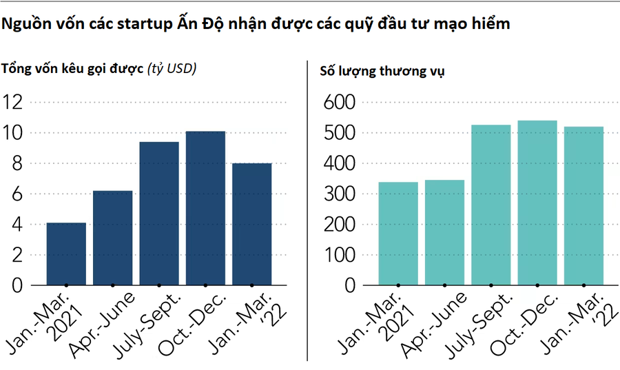 Theo nhà cung cấp dữ liệu CB Insights, các startup Ấn Độ đã huy động được 8 tỷ USD thông qua 520 thương vụ trong quý I/2022, giảm 20% so với mức 10 tỷ USD vào quý IV/2021.