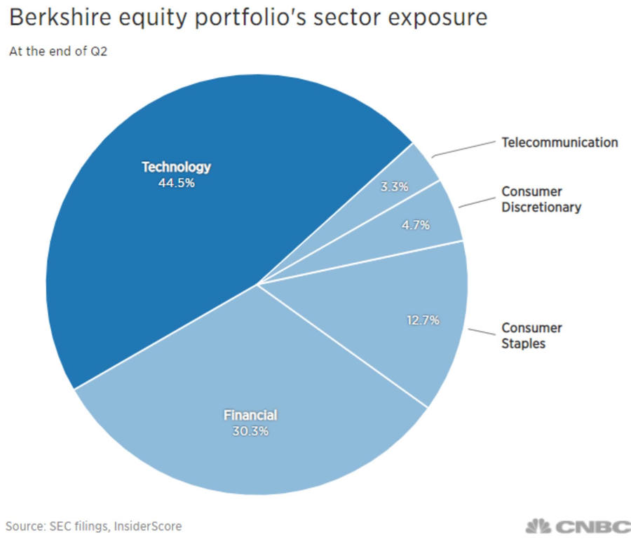 Theo InsiderScore, Berkshire ghi nhận tỷ lệ tiếp xúc với cổ phiếu công nghệ tăng 45%, phần lớn nhờ vào cổ phần khổng lồ tại Apple. Khoản đầu tư vào "nhà táo khuyết" được mua lần đầu vào năm 2016, hiện giá trị số cổ phiếu này đã tăng lên hơn 120 tỷ USD, trở thành danh mục đầu tư giá trị nhất trong lịch sử tập đoàn.