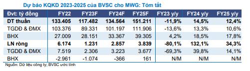 BVSC dự báo lợi nhuận ròng năm 2023 của Thế giới Di động có thể giảm mạnh 80,1% so với cùng kỳ, xuống còn 1.231 tỷ đồng. Trong đó, kết quả kinh doanh các quý còn lại của năm 2023 so với quý I/2023 có sự cải thiện, nhưng tiếp tục yếu hơn so với cùng kỳ năm trước.
