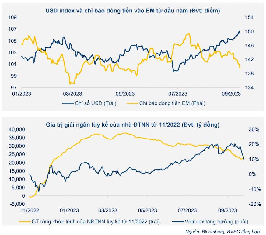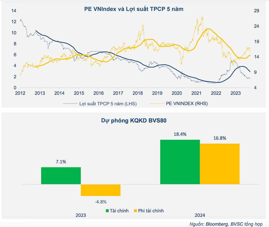 Liên quan tới thị trường chứng khoán, VN-Index đối mặt với rủi ro đến từ định giá một số nhóm đã ở mức đỉnh lịch sử và Việt Nam đồng tiếp tục mất giá. Tuy nhiên, BVSC nhận định rằng các rủi ro này sẽ giảm bớt nhờ triển vọng KQKD tích cực hơn trong 2024 và Fed kết thúc lộ trình tăng lãi suất vào cuối năm.
