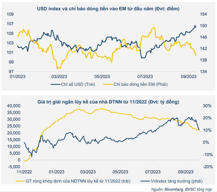 Trong báo cáo triển vọng mới đây, Chứng khoán Bảo Việt (BVSC)nhận định đồng USD mạnh lên là nguyên nhân khiến dòng vốn ngoại rút ra khỏi các thị trường mới nổi, trong đó có thị trường chứng khoán Việt Nam. Động thái bán ròng mạnh của khối ngoại tại vùng 1.200 - 1.250 điểm đã ảnh hưởng đến tâm lý thị trường và góp phần khiến VN-Index đảo chiều giảm điểm.