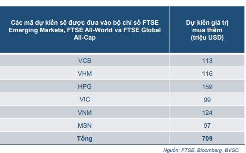 BVSC dự phóng một số cổ phiếu vốn hóa lớn dự kiến sẽ được đưa vào các bộ chỉ số trên gồm VCB, VHM, HPG VIC, VNM, MSN với giá trị mua thêm VCB (113 triệu USD), VHM (116 triệu USD), HPG (159 triệu USD), VIC (99 triệu USD), VNM (124 triệu USD), MSN (97 triệu USD).