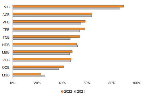 Theo VNDirect, VIB và ACB là hai ngân hàng có tỷ trọng bán lẻ cao nhất. VietinBank, VPBank, TPBank, và MB cũng là những cái tên đáng chú ý khi đã thành công trong việc tăng tỷ trọng cho vay bán lẻ trong năm qua.