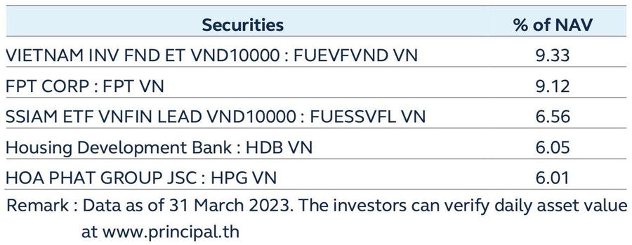 Một quỹ đầu tư khác của Thái Lan là PRINCIPAL VNEQ-A (Principal Vietnam Equity Fund) với quy mô 6,9 tỷ Bath (~208 triệu USD) cũng đang hiện diện tại Việt Nam. Top 5 khoản đầu tư lớn nhất của quỹ tại thời điểm cuối quý 1/2023 gồm FPT, HDB, HPG và 2 chứng chi quỹ DCVFM VNDiamond ETF và SSIAM VNFinLead ETF.