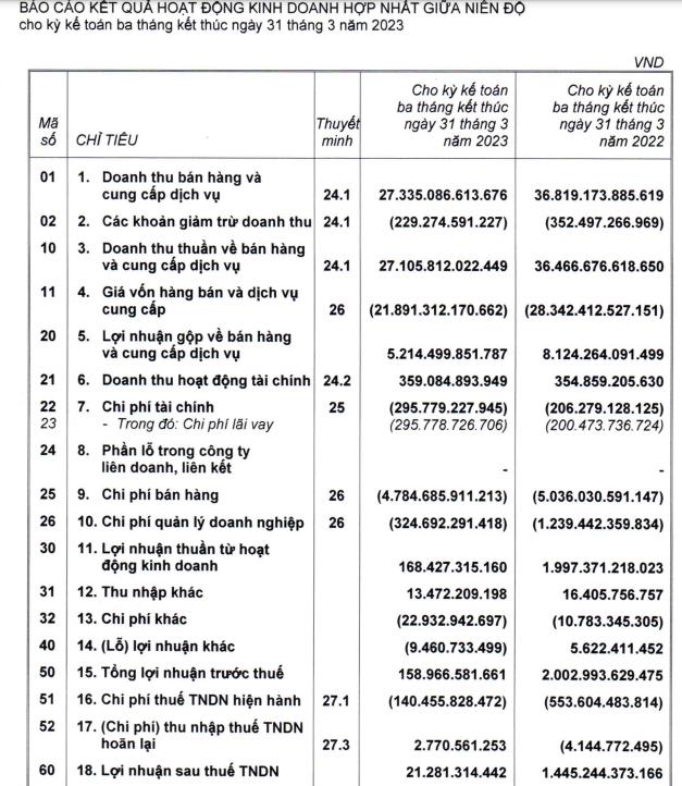 Doanh thu quý I/2023 cũng chỉ ghi nhận ở mức 27.105,8 tỷ đồng, giảm 25,7% so với cùng kỳ.