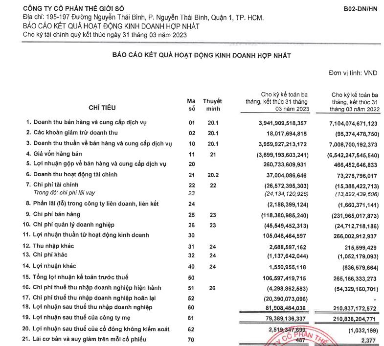 Công ty cổ phần Thế giới Số (Digiworld, mã ck: DGW) mới đây công bố báo cáo tài chính hợp nhất quý I/2023 với kết quả có phần ảm đạm.